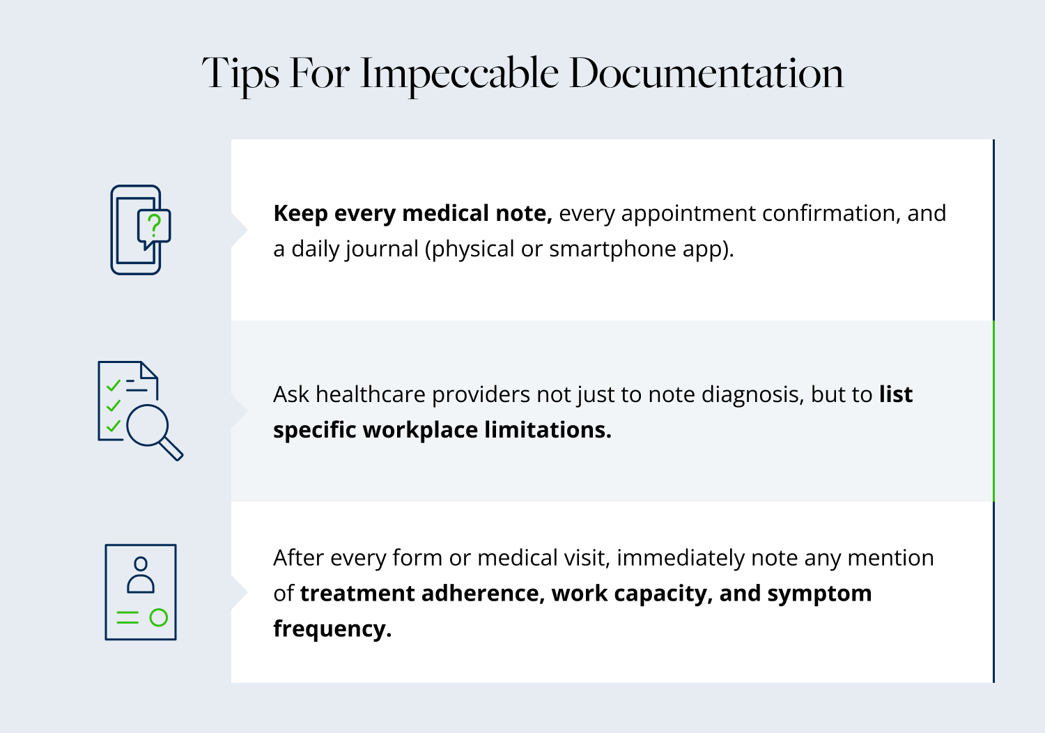 Keep detailed medical records and notes about symptom severity, daily struggles, and care plans